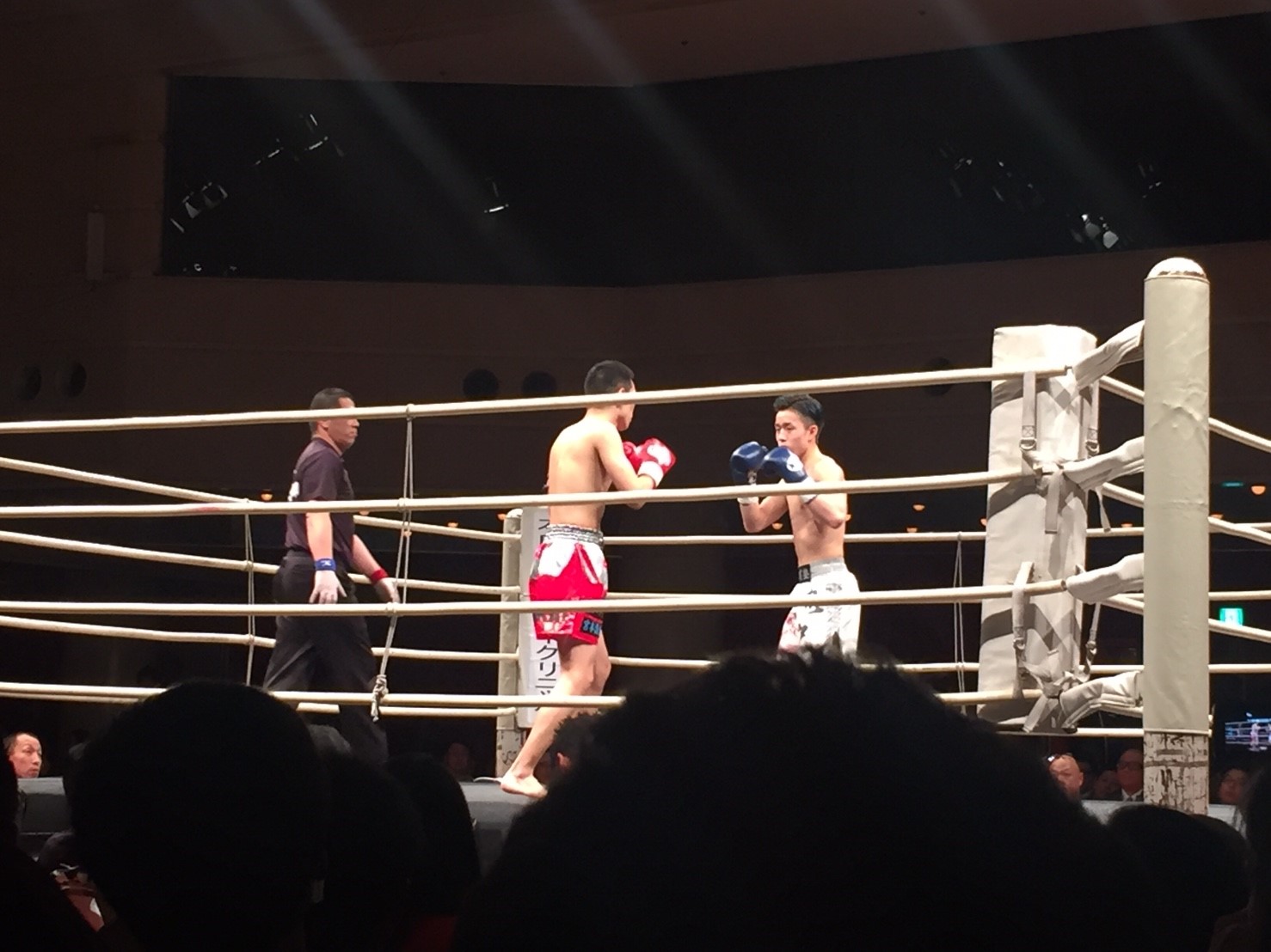 早い段階でパンチが当たれば大月選手の展開で、序盤にかみ合わないと辻出選手に有利かな?とぼんやりと考えていたのですが、試合のが始まってみると開始直後から辻出選手が真っ向勝負に出るという展開になりました。
